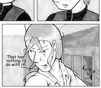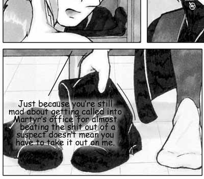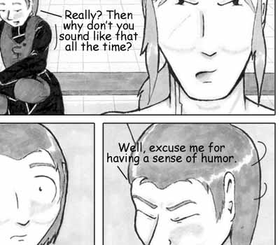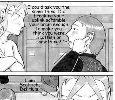 Author's Note: What really struck me about this page is how hurt Del looks in Panel 5. I never really intended for it to come out that way, but I liked it enough to keep it. I also thought Panel 2 turned out pretty well -- I'm getting more comfortable with upshots, the more I practice. :) Oh, and I'm really not sure who those random people are in the background -- probably another team coming in to take over for the night shift. I'm sure they're getting a kick out of the drama... |
