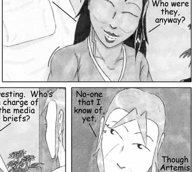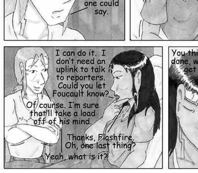 Author's Note: This page should have been done much earlier, except I had an emergency redraw of the last panel to do. Flashfire's expression didn't turn out anywhere near right in the first attempt, and I was too distracted by web admin stuff to notice (even though I inked and toned it, yeah I know) until I was Photoshopping the page Saturday. >< I had the choice between attempting to hack-Photoshop it into respectability (similar to the window problem a couple pages ago), or just take the 20 minutes to redraw it. Though I hate redrawing panels, it seemed like the only sensible alternative, hence the tiny delay.