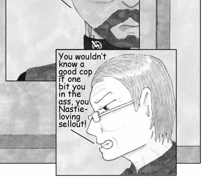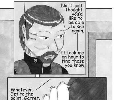 Author's Note: For some reason, I had the hardest time getting motivated to finish the page this week. I'm not sure why -- the layout's fine (though the vertical background panels aren't quite as good as the horizontal), and the art came out okay. It just took me forever to work up the gumption to get it done. :/ Sometimes this happens, my enthusiasm tends to wax and wane; I'm not really sure what causes it but it could be linked to sunspots or possibly the phases of Venus. Anyway, I digress. It's times like this that I remember why I stick so rigidly to my update schedule -- if I didn't and got to feeling this way, I'd probably stop drawing for a month or two before deciding to start again. And I don't want that, thanks.