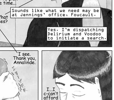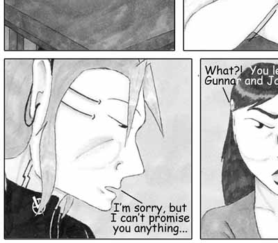 Author's Note: I really like how Annalinde's little-girl-lost act shattered as soon as she realized she wasn't going to get her way. Oh, and for those of you who don't remember -- Gunnar and Jack are these guys from waaaay back in the beginning of the story. We last saw them in Issue 5, left to a rather ambiguous fate... And you thought I forgot about them, didn't you? ;) |