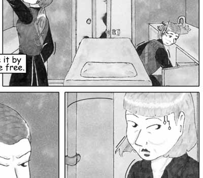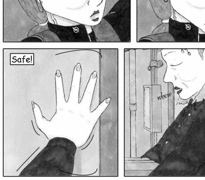 Author's Note: This will probably sound a little pretentious, especially coming from someone with such a limited drawing skill, but it's true: Never underestimate the power of perspective to "ground" an environment and give it realism. Even just a dumb little one-point perspective like in Panel 3 -- all the extra time it takes to set up a vanishing point and line everything up to it is definitely worth it. Eyeballing it may be faster, but it sure doesn't look as nice.