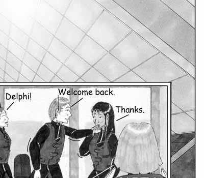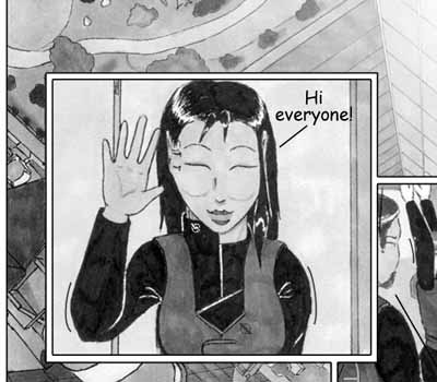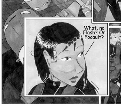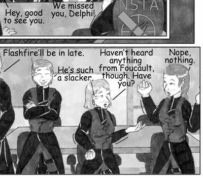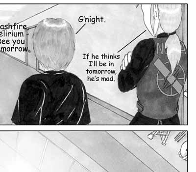 Author's Note: LENS FLARE ABUSE!:D Didn't come out quite as nice as I would have liked, but that's what I get for expecting a cheesy, overused Photoshop filter to stand-in for the sun. The whole page really didn't turn out as good as I had hoped. I probably should have spend a little more time on the lighting for the cityscape. As it was, I was scrambling to get it done at all. Stupid overtime. :(