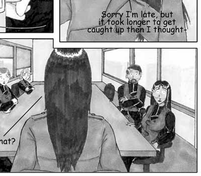 Author's Note: I'm happier with this page than last week's. I love Delphi's expression when she hears what happened. And you're probably wondering (like the team) why Mizuhara's giving the briefing. Patience, all will be revealed in time. :) On another note, if I had time, I'd love to do a Haruhi dance animation with Mizu as Haruhi, and Flash, Del, Delphi and Artemis as the backups (yeah, I know they aren't actually her team but it would be funnier). :D 'Course, by the time I finished it, Haruhi would be passe. But it's a nice thought, and is really funny to imagine. |