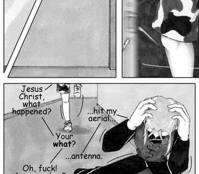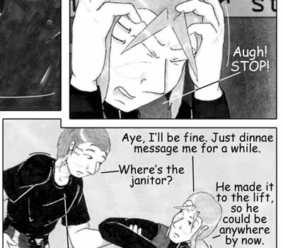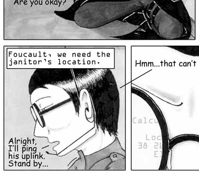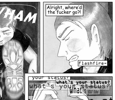 Author's Note: Yup, Del's back. You didn't think a locked door was going to hold him for long, did you? :D Oh, and I know I should have come up with some sort of witty phrase to put on his t-shirt, but nothing really worked. I have to admit, though, I was sorely tempted to have it say 'Bitches don't know bout MAH LAZER!' but decided against it. After all, will image macros really be around in 2035? Discretion won, and you'll have to imagine your own t-shirt phrase. You can do it, though. I believe in you. ;) And yes, Flash's accent is back. I mean, considering the amount of pain he's in, is it really all that surprising? |