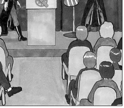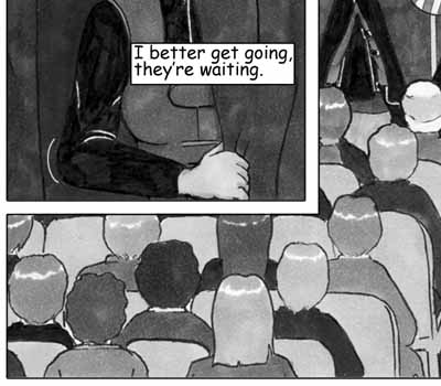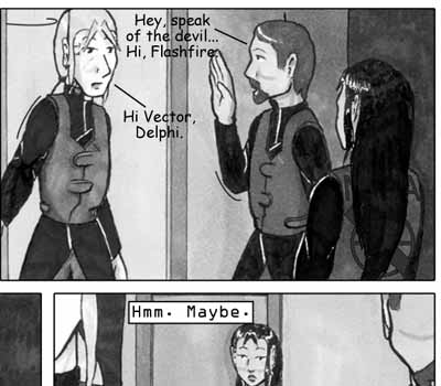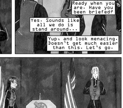 Author's Note: If you look at the cameraman in Panel 1, you'll notice that civilians can have cybernetics, too. :) I know this isn't terribly apparent sometimes, but more than Agents and military personnel can get implants, it's just not too common. Oh, and yes -- there are two US flags flanking the podium, mainly because I couldn't decide on what other one to have there. I suppose the state flag could've worked, but I kinda like the double stars-'n-stripes. A little extra patriotism never hurt anyone's image, right? :) |