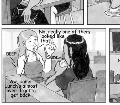 Author's Note: Anyone who works with me will probably recognize the layout of the cafeteria, down to the inclusion of large LCD TV screens (never showing anything interesting, unfortunately) -- I was running a little short of time and didn't want to bother coming up with a whole new layout for an office cafe, so I just drew what I knew... :D |
