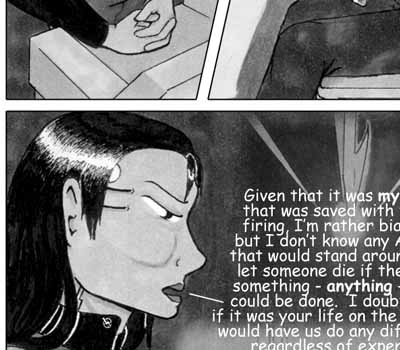 Author's Note: Yes, those are bloody tears she's crying. (I know, how emo, but there's a reason...)See, the optical cybernetics block off the tear ducts slightly - not enough to prevent normal eye moisture, but enough to prevent tears. so, if a person gets emotional enough to try to cry, the tear ducts will become irritated and a little blood will be mixed into the tears. Hence, bloody tears. Now you know. |