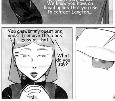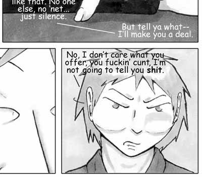 Author's Note: I hope you enjoyed the wonderful, full-color interlude Marko provided while I was away. Those that missed it, you can catch up here. In other news, I've noticed recently how much Carcage here is beginning to resemble Ichigo from Bleach. This is not intended whatsoever, as I don't really even watch Bleach except in 10-minute increments as I am getting ready to leave for work in the morning (Adult Swim shows it. Yes, I said morning. Yes, I really do get up that early to get to work. Don't ask), so I don't know what's going on here. Maybe it's because they're both obstinate jerks, or something. :D Anyhow, I think he's turning out to be a much tougher nut ot crack than Artemis expected... |