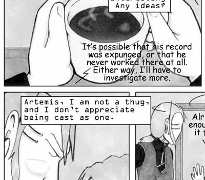 Author's Note: See? And you thought I forgot about Flash's angsting. Ah, not so. While he's probably genuinely upset, I have a feeling it's more directed at Artemis for putting him in this situation, rather than Carcage. Still, he pulls it off rather well. Also, Foucault and Artemis are talking about something that happened way back on Page 7. See, I didn't forget about that either. :D Sometimes my memory works... |