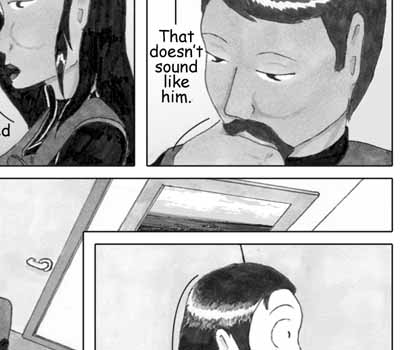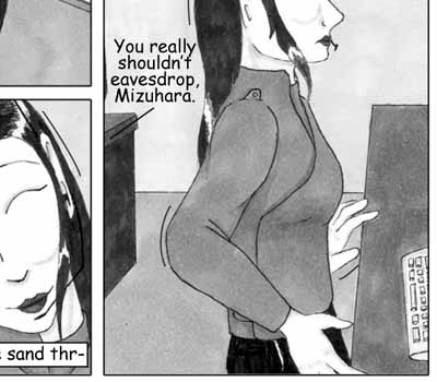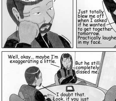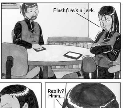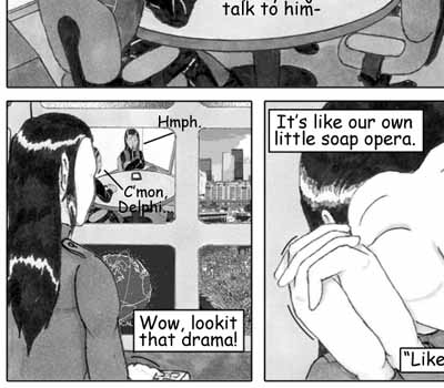 Author's Note: So, I have figured out that ellipses are my natural enemies. I don't know why I decided that the little conference room that Delphi and Vector are sharing needed to have a round table -- it just did. And after an hour and a half of me cursing and erasing and redoing three point perspective ellipse constructions, I rather wish it didn't. So, why do the ellipses on the page look so nice then, you ask? Answer: 'Cause I cheated and used the path tool in Photoshop. I know when I'm beat. :D