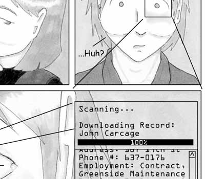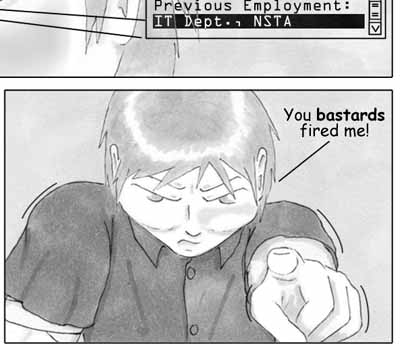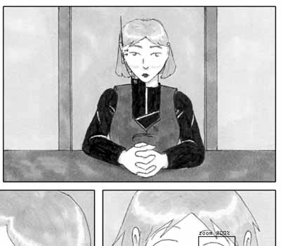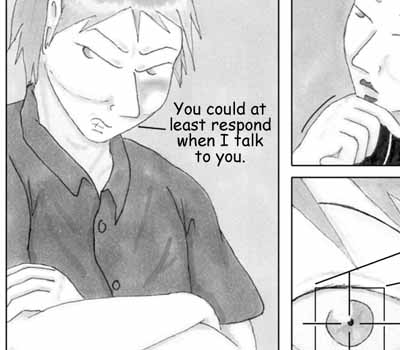 Sometimes silence is better than any question, especially when dealing with someone high-strung and impatient. I like how the middle of the page turned out -- changing the look of the eye (such as adding the bottom lid) was kind of scary but ultimately the right way to go with the large panel. If I was a better artist, I'd draw all the eyes that way... Oh, and in other news, I received my first review today. The overall response was basically "meh" -- the writing's good but the art sucks. So, as you can imagine, I'm feeling a little low right now. If you want my full thoughts on it, feel free to read this, but be warned -- it does contain quite a bit of whining. |